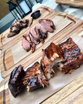The meats are smoked then quickly seared the grill for more char flavor. Both the brisket and signature tri-tip had good flavor, but was a tad tough to chew. The baby back ribs were excellent and not overcooked, although the presentation left a lot to be desired. Based on the jagged edges of the rubs, it looked like the ribs were simply torn into apart by hand, or cut with a very blunt knife.